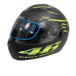 El casco integral Project 46 para motocicleta destaca por su diseño deportivo en negro con amarillo neón, ideal para riders que buscan máxima visibilidad, protección certificada y estilo moderno. Su formato integral cubre completamente el rostro, incluyendo la barbilla, entregando mayor seguridad tanto en ciudad como en carretera.