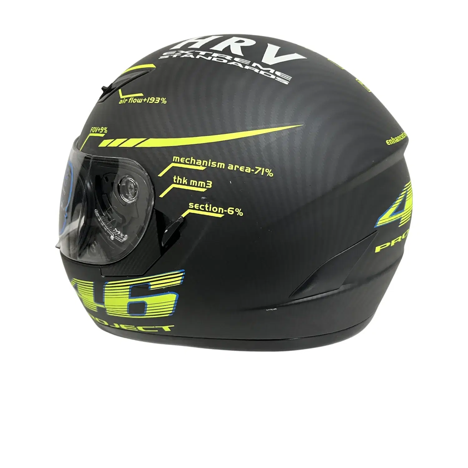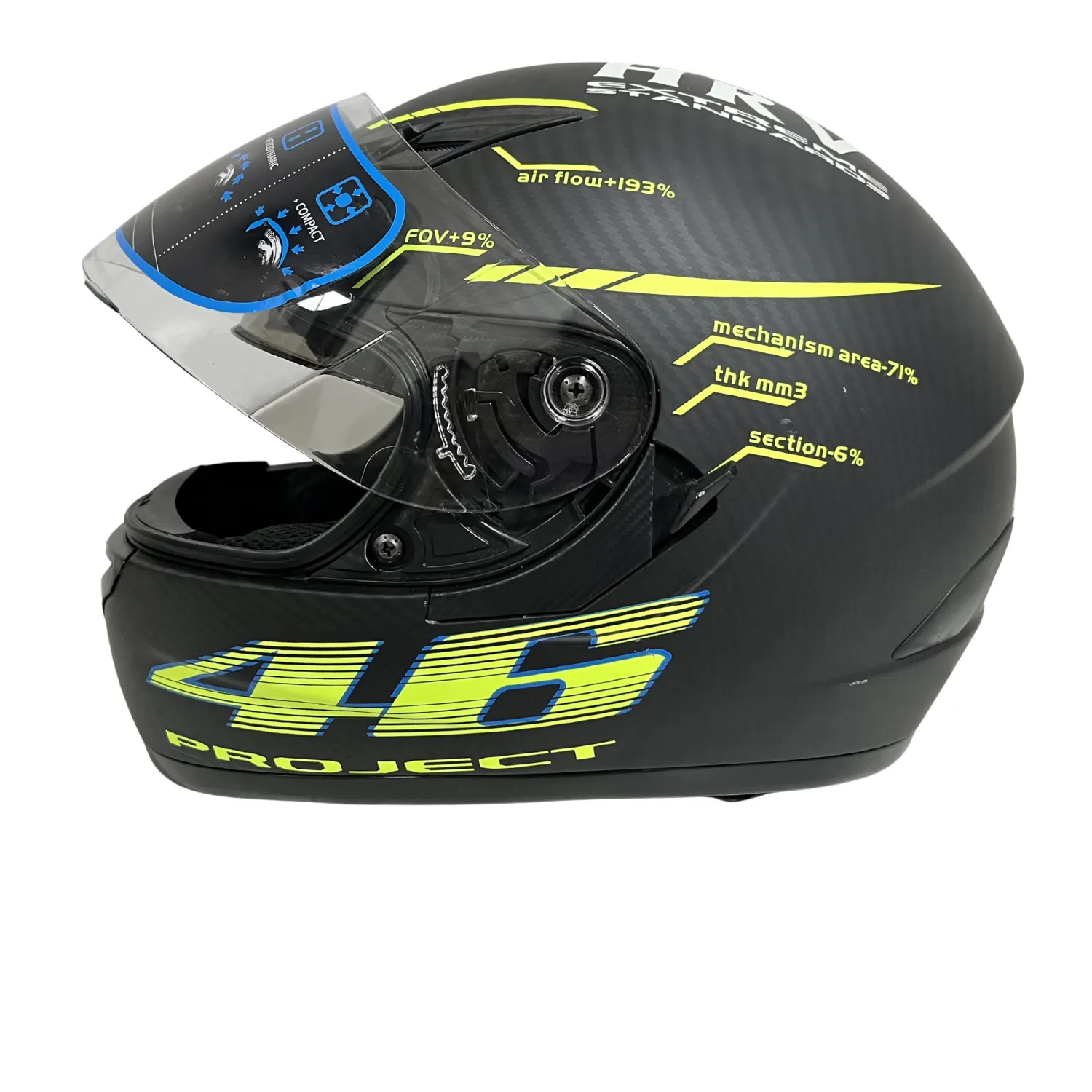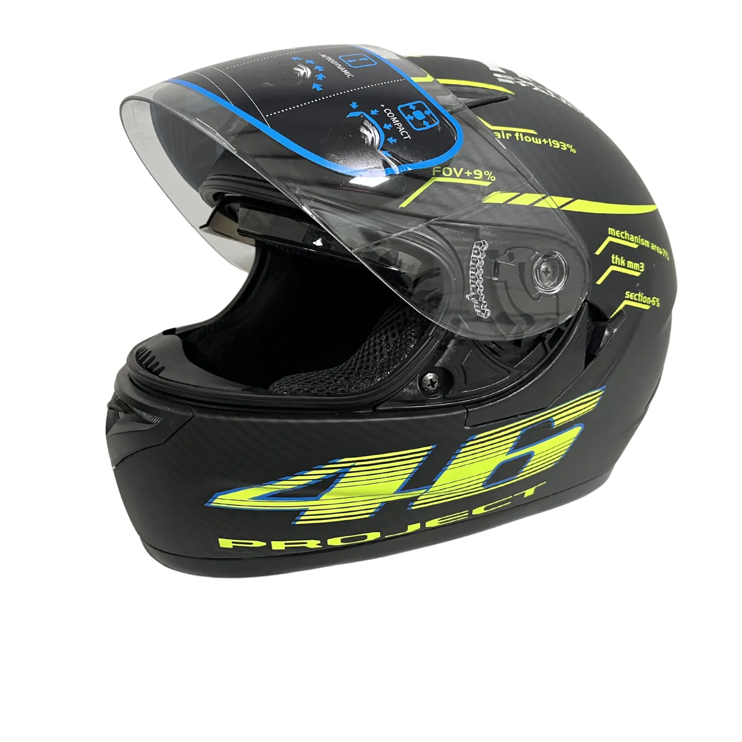 El casco integral Project 46 para motocicleta destaca por su diseño deportivo en negro con amarillo neón, ideal para riders que buscan máxima visibilidad, protección certificada y estilo moderno. Su formato integral cubre completamente el rostro, incluyendo la barbilla, entregando mayor seguridad tanto en ciudad como en carretera.