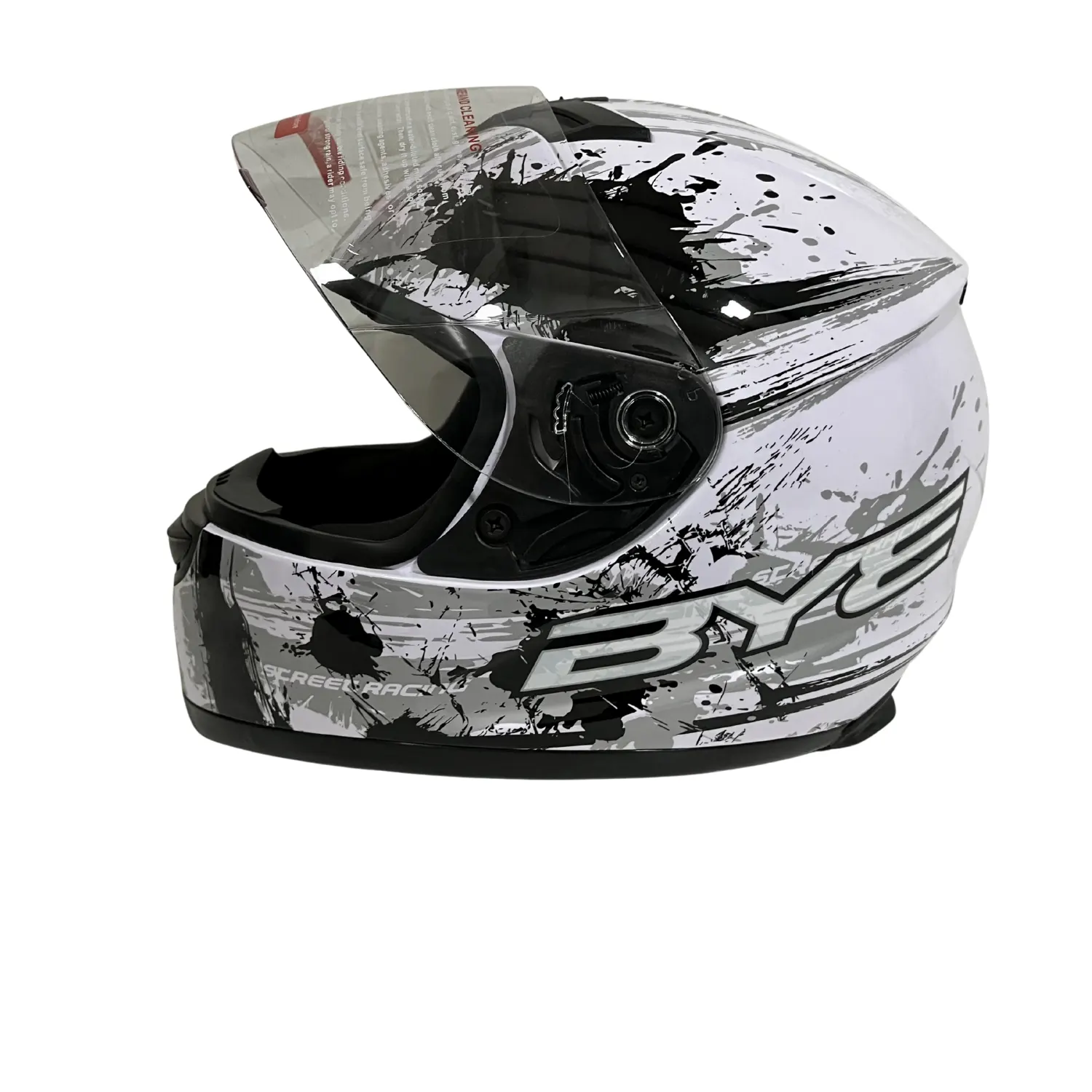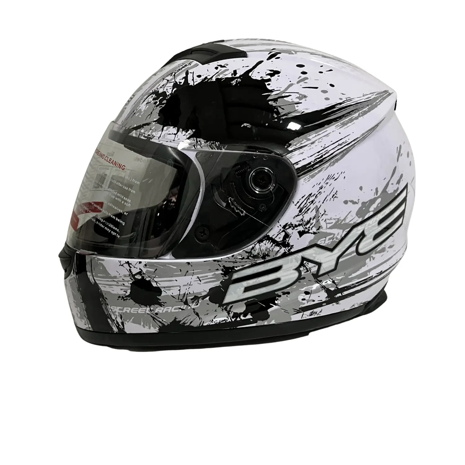 El casco integral para motocicleta BYE destaca por su diseño gráfico moderno de salpicaduras en blanco y negro, ideal para quienes buscan estilo, protección y comodidad en cada trayecto. Su formato integral cubre completamente el rostro, entregando mayor seguridad tanto en ciudad como en carretera.